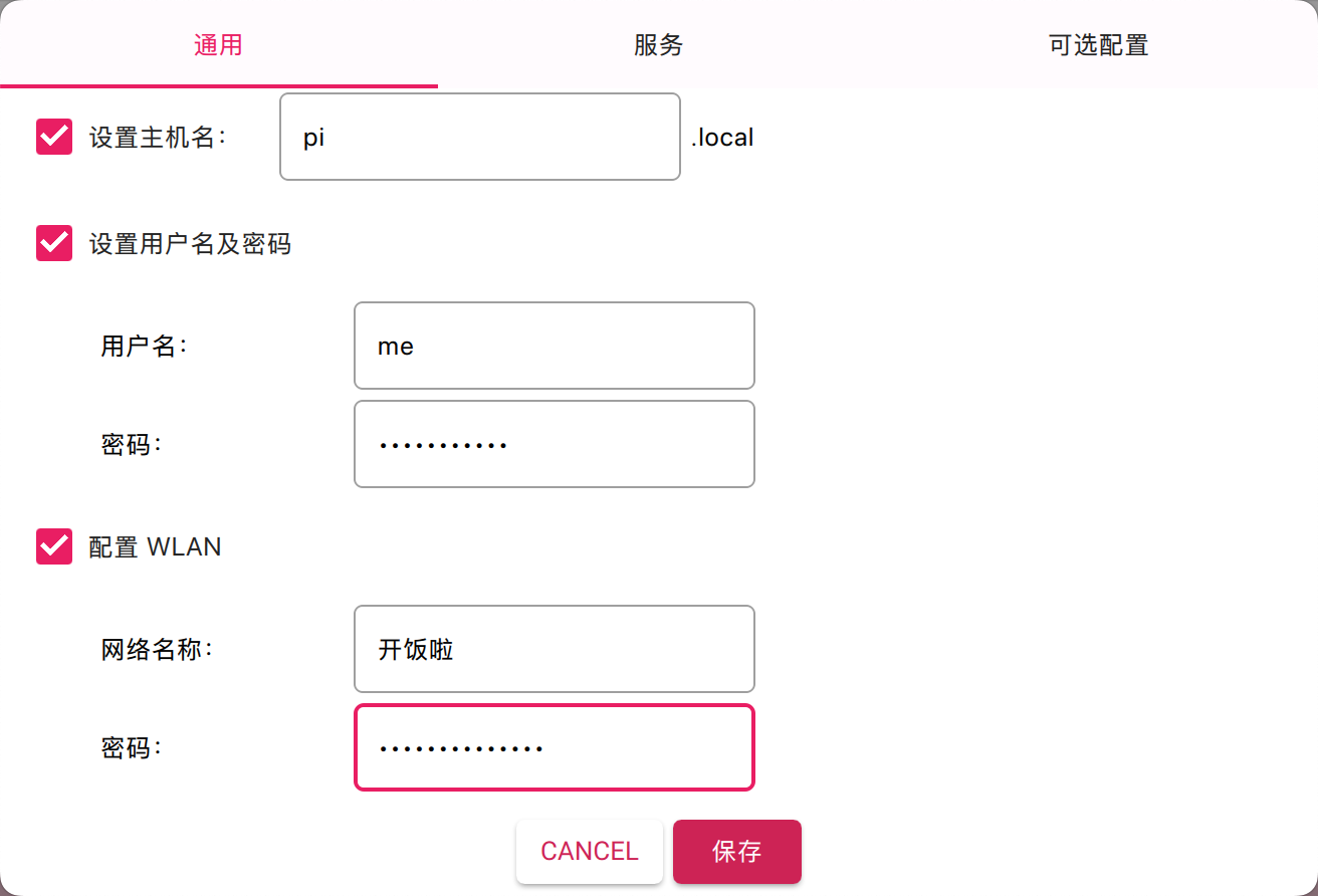 首先,准备SD卡,烧录最新的Raspberry Pi OS镜像到SD卡上。现在官方出了Raspberry Pi Imager,烧录镜像变得更简单了,这里烧录镜像的时候要注意几个细节,首先是必须把Wi-Fi账号密码配置好(后面可以改,第一次配置需要用Wi-Fi),然后必须开启SSH,其余的按需调整: