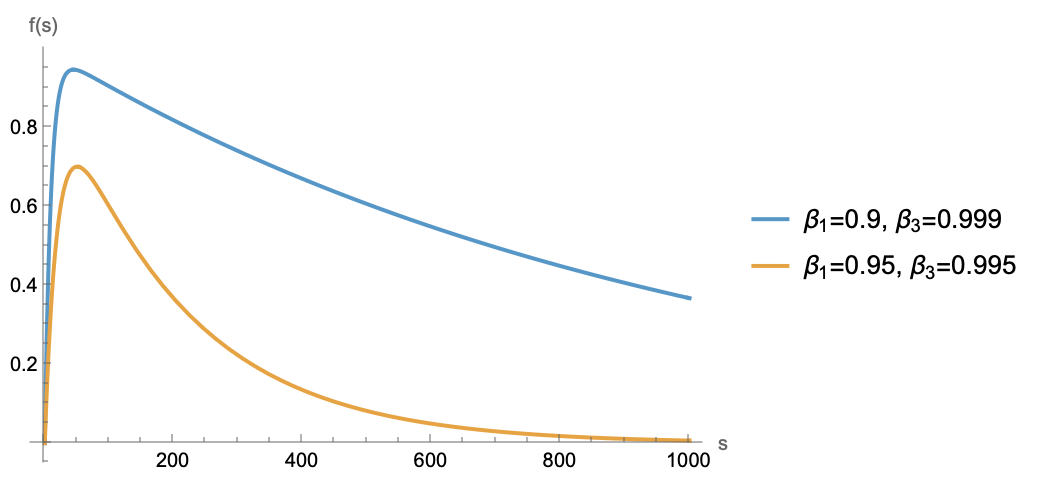 数据是以梯度形式线性叠加到$\bar{\boldsymbol{m}}_t$中的,假设每一步梯度只包含当前Batch的信息,那么某个Batch想要不被遗忘,系数$\beta_3^{t-j+1} - \beta_1^{t-j+1}$就不能太小。考察函数$f(s) = \beta_3^s - \beta_1^s$,它是一个先增后减的函数,但因为$\beta_3$会比$\beta_1$更接近于1,所以增的步数不多,远处更多是接近指数下降,如下图: