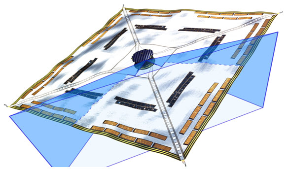 “伊卡洛斯”是一个高1米、直径长1.6米的筒状小型航天器,采用直升机式构型。它在太空释放后,卷在航天器上的超薄膜太阳帆通过转动圆柱形机体(转速为25转/分)所产生的离心力徐徐展开,并形成边长14米、对角线距离为20米、厚度仅0.0075毫米的正方形帆面。帆面上面还嵌有一些25微米厚的硅薄膜太阳电池,它们占总帆面面积约5%,预计产生500瓦电能。这些电能除用于验证薄膜太阳能电池的功能外,还为所携带的设备供电。“伊卡洛斯”的总质量为315千克,其中帆面的质量为15千克。它现在正依靠太阳光子的推动力飞往金星。执行任务期间“伊卡洛斯”采用自旋稳定方式,自旋速度约20转/分。