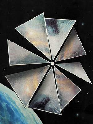 2005年6月21日,世界上第一个大型太阳帆一—“宇宙1号”由前苏联遗留下来的SS-N-18型洲际弹道导弹(核弹头已被拆卸)改装而成的“波浪号”火箭从水下潜艇发射升空。该太阳帆由美国行星学会投资,俄罗斯负责建造,该设计方案听起来很美:“宇宙1号”进入绕地轨道以后,打开8个如风车叶片的三角形帆,绕地飞行至少一个月。“宇宙1号”的质量大约100千克, 帆叶的长度为15米,由镀铝的增强型聚酯薄膜做成,仅5微米厚,大约相当于塑料垃圾袋厚度的1/4。这些帆叶以航 天器的主体为中心环绕排列,当“宇宙1号”进入轨道后它们能被充气管展开,展开后的形状像花瓣一样,总面积达600平方米,相当于一个篮球场面积的1.5倍。当“宇宙1号”在环绕地球的轨 道上运行时,它的巨大帆能调整角度,像直升机的旋翼一样旋转,以便反射不同方向上的太阳光。“宇宙1号”的控制算法事先 被编入其携带的计算机中,能够通过地面发出的指令对其进行操作。如果地面控制人员不想让太阳光推动“宇宙1号”,就可旋转太阳帆的叶片,让它的刀口对准太阳,这样就不会产生推力了;而当“宇宙1号”需要推力时,控制人员可把帆的角度旋转回去。“宇宙1号”的主要有效载荷包括成像仪和加速计。当它展开巨大的帆时,成像仪会对其成像,同时还要对地球拍照;而加速计则用于测量“宇宙1号”是怎样逐渐加速的。