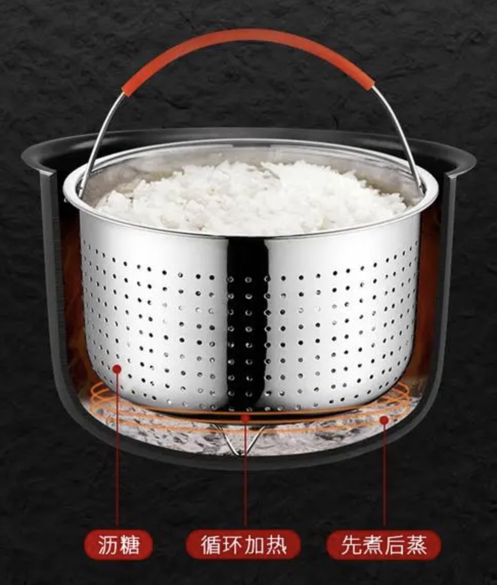 让笔者万万没想到的是,随着低糖饮食的兴起,米汤居然以一个高大上的概念回归了,那就是本文开头所说的“低糖电饭锅”、“低淀粉电饭锅”。这些电饭煲的原理也很简单,在电饭锅内胆加一个带细孔的容器,把米放进去煮即可。有些产品可能做得更加一体化,但原理都是一样的,而且它们还有一个共同点——“贵”——两三百已经算是最便宜的了,稍贵的六七百,更贵的上千。