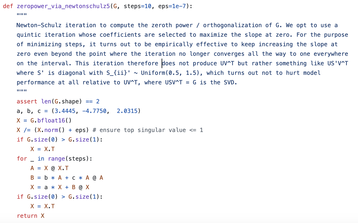 实践中,如果每一步都对$\boldsymbol{M}$做SVD来求解$\text{msign}(\boldsymbol{M})$的话,那么计算成本还是比较大的,因此作者提出了用Newton-schulz迭代来近似计算$\text{msign}(\boldsymbol{M})$。