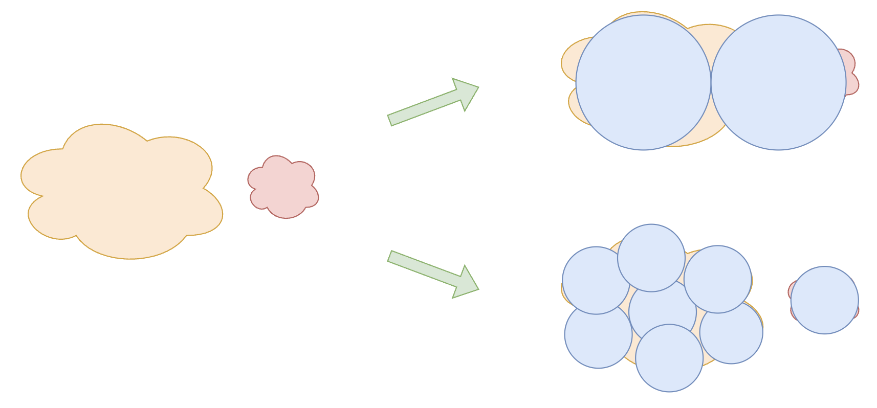 关于Fine-Grained Expert的有效性,笔者这里提出另外一种不大容易察觉的解释,它跟本文的主题有关:更多数量、更细颗粒度的Expert,可以更好地模拟现实世界的非均匀性。以下图为例,假设知识可以分为一大一小两类,每个Expert则是一个圆,如果我们用2个大圆去覆盖,那么存在一定的遗漏和浪费,而如果改用8个总面积相同的小圆,那么就可以覆盖得更为细致,因此效果更优。