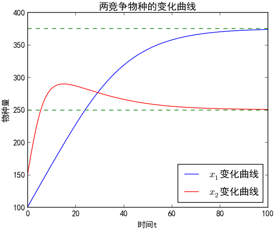 这些参数表明,$x_1$是一个增长相对缓慢的物种,但是种内竞争较小,而且不容易受到$x_2$物种的影响,因此,长远来看,$x_1$物种将在该自然环境中占优;相比之下,$x_2$物种的增长速度较快,但是种内竞争较大,而且容易受到$x_1$物种的影响,因此在长期的竞争中,$x_2$物种将处于稍弱的地位。下面的数值求解结果支持了这一推测。