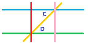 首先我们有两条平行线:蓝色线和绿色线,黄色线是跟平行线相交的直线,从而得到两个内错角C和D。紧接着,过C角处的交点,作粉红色的线垂直于蓝色线,然后可以证明粉红色线也垂直于绿色线。这步很显然,但也需要证明。如果粉红色线不垂直于绿色线,那么可以按前面的方法,坐出另外一条过同样的点而又与蓝色线平行的线来,从而过同一点有两条不同的直线与蓝色线平行,矛盾。顺便地,我们容易证明红色线平行于粉红色线。