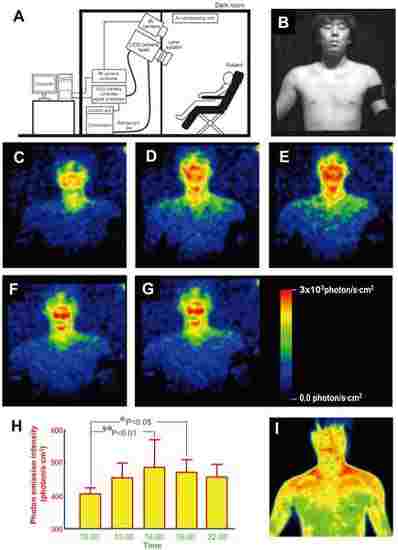 为了进一步了解这种微弱的可见光,日本科学家使用了能检测到单光子的超敏摄像机。5名20多岁的健康男性被安排连续3天,每天从上午10点到晚上10点,每隔3小时上身赤裸站在摄像机前20分钟,房间不透光,一片漆黑。研究人员发现,身体发光强度在一天内起起伏伏,发光最弱的时候是上午10点,发光最强的时候是下午4点,之后逐渐变弱。这些发现显示,发光和我们的生物钟有关,最可能与我们的代谢节律在一天中的波动状况有关。