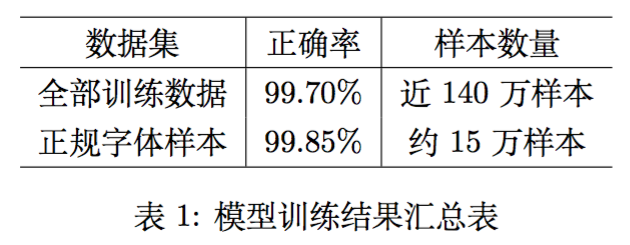 从表1可以看到,即便在加入了随机噪音的样本中,模型的正确率仍然有99.7%,因此,我们有把握地说,单纯从单字识别这部分来看,我们的结果已经达到了state of the art级别,而且在黑体、宋体等正规字体中(正规字体样本是指所有训练样本中,字体为黑体、宋体、楷体、微软雅黑和Arial unicode MS的训练样本,这几种字体常见于印刷体中.),正确率更加高!