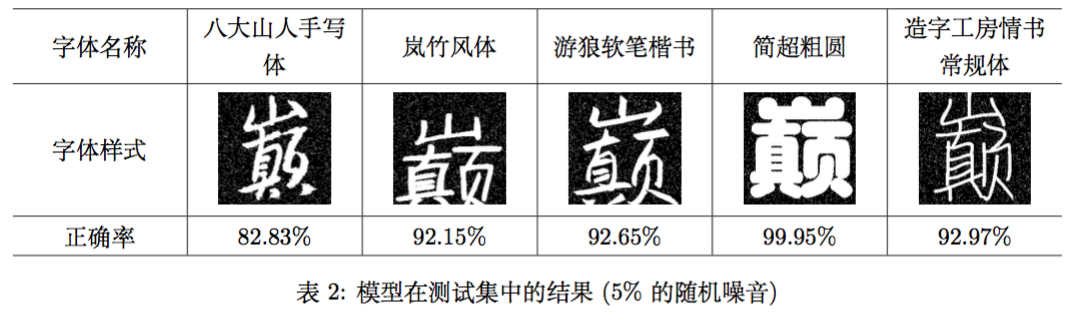 我们另外挑选了5种字体,根据同样的方法生成了一批测试样本(每种字体30620张,共153100张),用来对模型进行测试,得到模型测试正确率为92.11%. 五种字体的测试结果如表2.