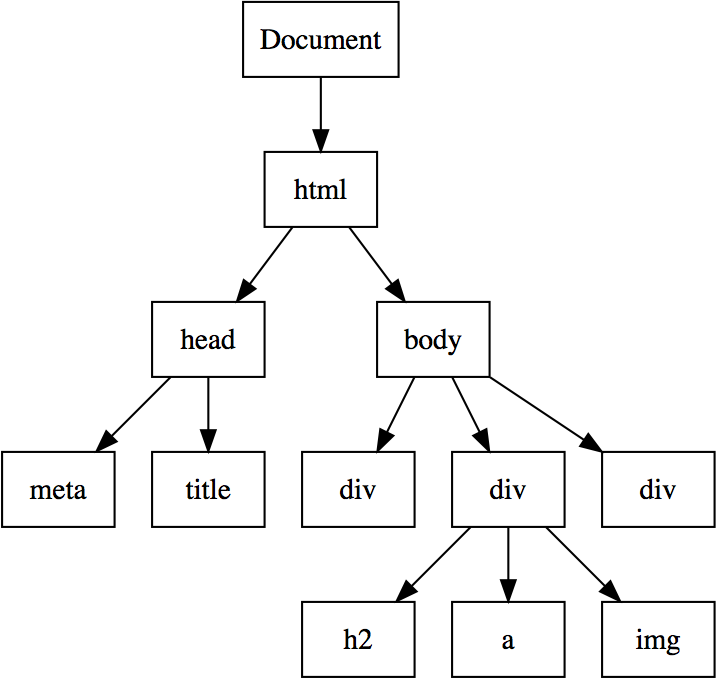 我们可以把一个HTML页面的源代码,解析为树结构,称为DOM树,全称为Document Object Model。它是一个文档对象模型, 使用对象的表示方式来表示对应的文档结构及其中的内容。如前面所示的HTML页面,可以表示为如下的DOM树结构: