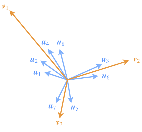 为了突出模长的这一含义,也需要在设计模型的时候有所配合。如图,尽管$\boldsymbol{v}_1$所代表的类所包含的特征向量$\boldsymbol{u}_1,\boldsymbol{u}_2,\boldsymbol{u}_4,\boldsymbol{u}_8$的模长均比较小,但因为成员多(“小弟多”),因此$\boldsymbol{v}_1$的模长也能占优(“势力大”)。这说明,一个类要突出,跟类内向量的数目、每个类内向量本身的模长都有关联。后面我们也会看到Capsule是如何体现这一点的。