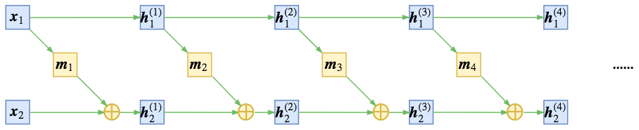 &\boldsymbol{h}^{(3)}_{2} = \boldsymbol{h}^{(2)}_{2} + \boldsymbol{m}_3\big(\boldsymbol{h}^{(2)}_{1}\big)\end{aligned} & \begin{aligned}&\boldsymbol{h}^{(4)}_{1} = \boldsymbol{h}^{(3)}_{1} + \boldsymbol{m}_4\big(\boldsymbol{h}^{(3)}_{2}\big)\\