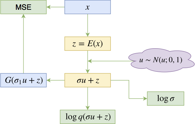 $$\begin{equation}\begin{aligned}\iint \tilde{p}(x)q(u)\bigg[ &\frac{1}{2\sigma_2^2}\Vert G(\sigma_1 u + E(x))-x\Vert^2 + \frac{1}{2}\Vert F(\sigma_1 u + E(x))\Vert^2 \\
