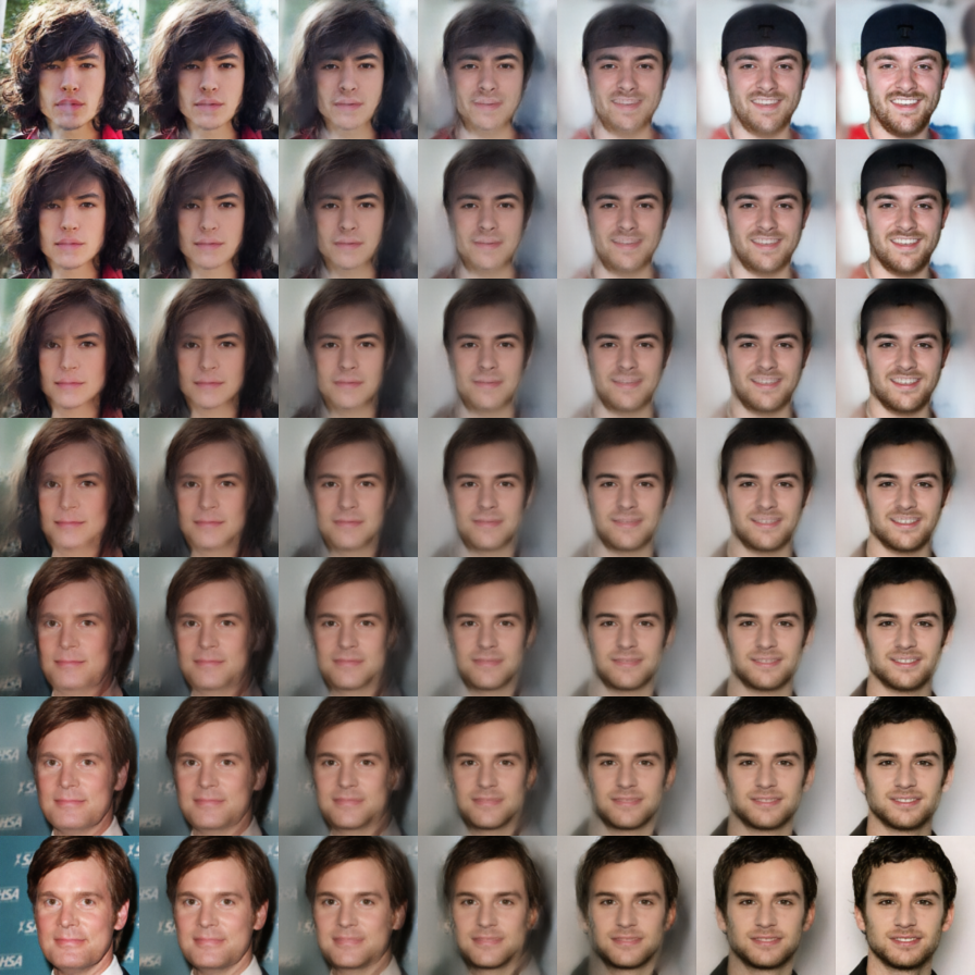 受GPU设备所限,我们仅仅在CelebA HQ上做了64x64和128x128的实验。我们先在64x64图像上对类似规模的VAEs、Glow和f-VAEs做了个对比,然后再详细展示了128x128的生成效果。