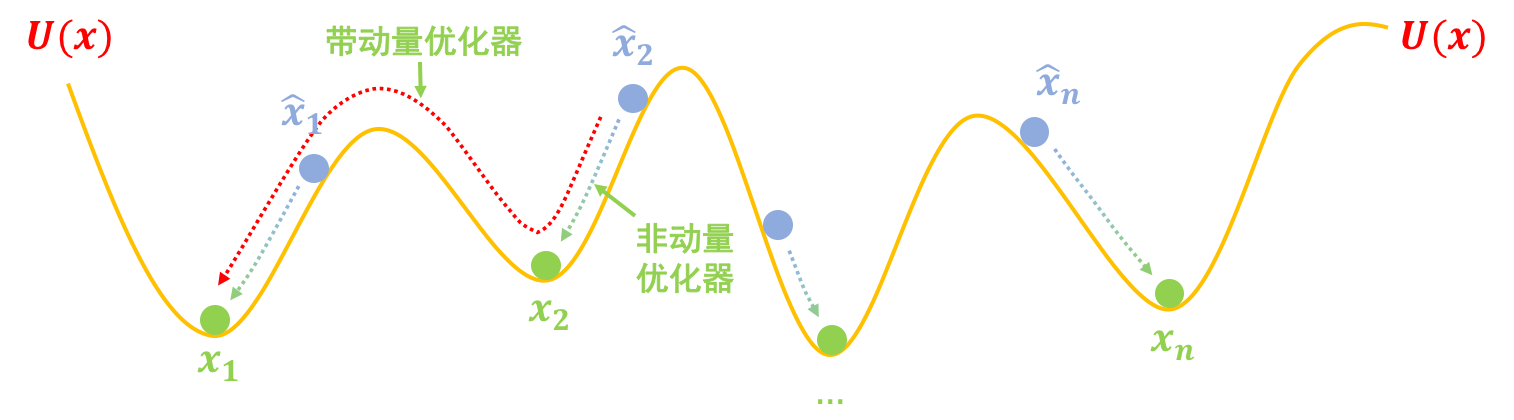 然后看“跳坑”,也就是坑挖好了,$U$固定了,我们让假样本滚到坑底,也就是让$U(x)$下降,滚到最近的一个坑,所以