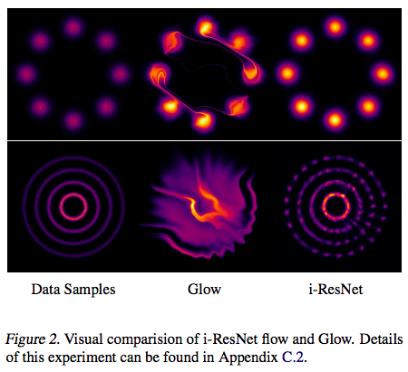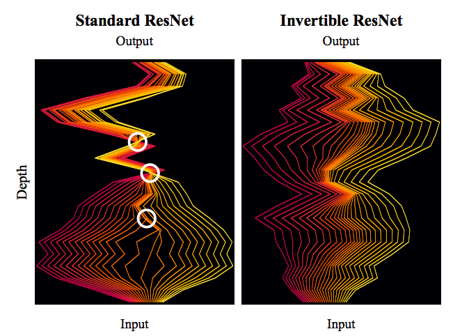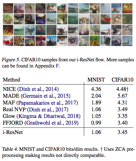 意味着它是信息无损的,意味着它或许可以用来做更好的分类网络,意味着可以直接用最大似然来做生成模型,而且得益于ResNet强大的能力,意味着它可能有着比之前的Glow模型更好的表现~总而言之,如果一个模型是可逆的,可逆的成本不高而且拟合能力强,那么它就有很广的用途(分类、密度估计和生成任务,等等)。