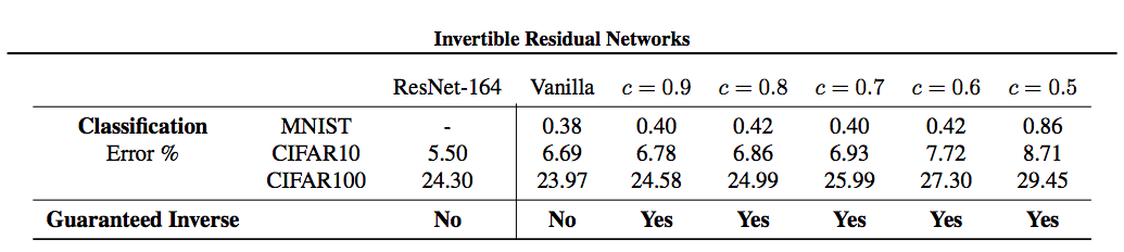 一开始我们就说了,既然是ResNet的一种,最基本的用途就是分类了。下表表明用可逆ResNet做分类任务,效果也是很不错的,Lipschitz约束的存在不会明显影响分类结果(表中的$c$就是$\text{Lip}(g)$)。