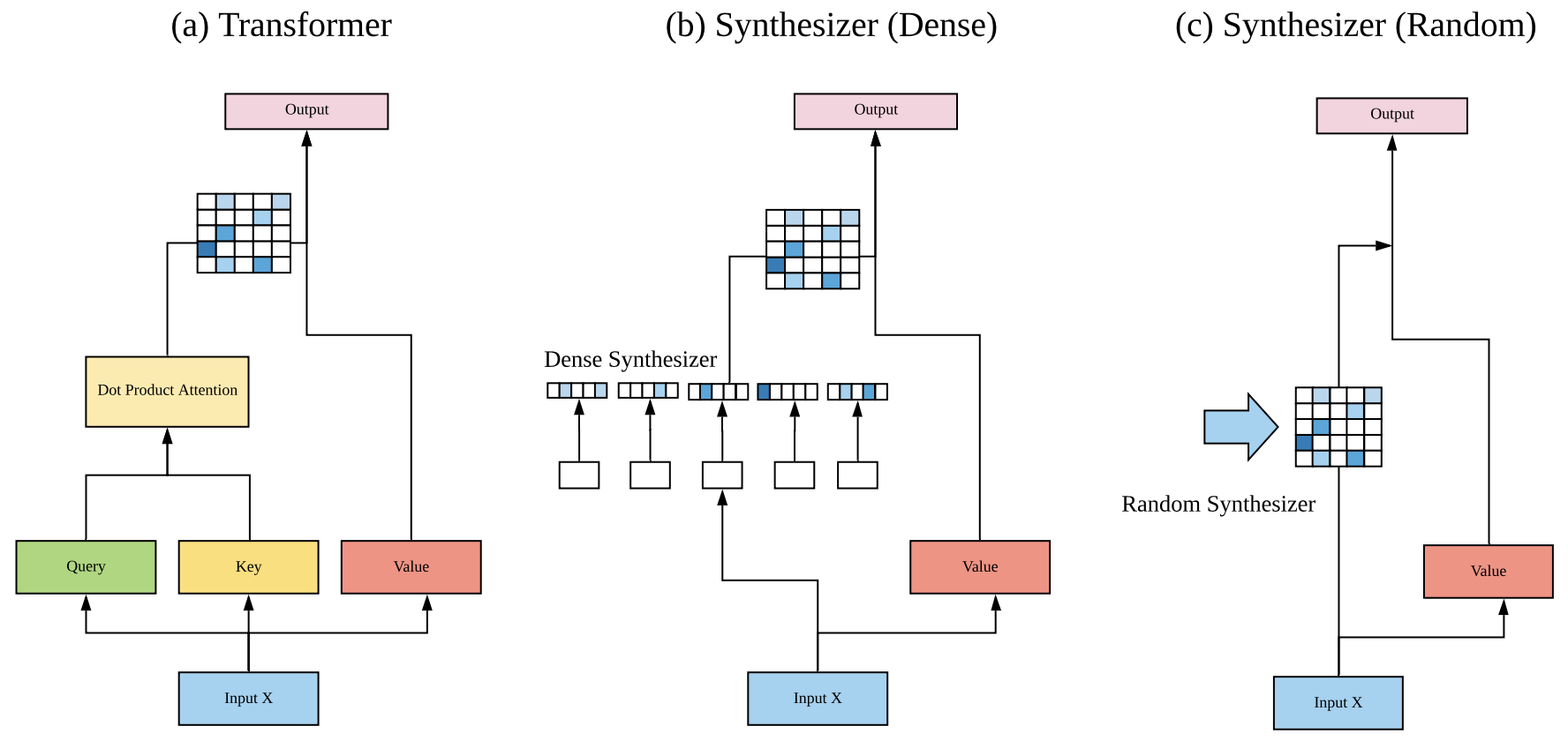 那么,就到了前面提出的问题:“token对token”是必须的吗?能不能通过其他方式来生成这个矩阵$\boldsymbol{B}$?Google的这篇论文正是“天马行空”了几种新的形式并做了实验,这些形式统称为Synthesizer。