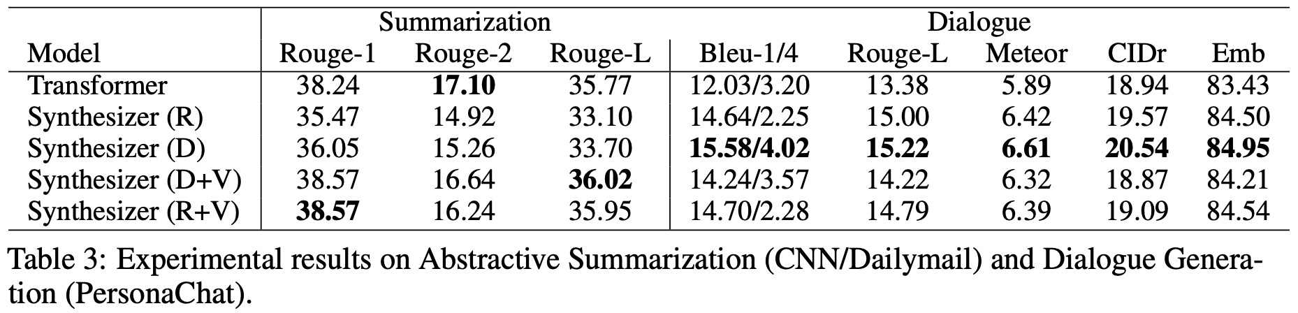 在自动摘要这个任务上,标准注意力效果比较好,但是对话生成这个任务上,结果则反过来:标准的自注意力是最差的,Dense(D)和Random(R)是最好的,而当Dense和Random混合了标准的自注意力后(即 D+V 和 R+V),效果也变差了。这说明标准注意力并没有什么“独占鳌头”的优势,而几个Synthesizer看起来是标准注意力的“退化”,但事实上它们互不从属,各有优势。