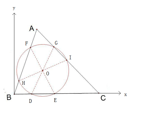 设A点的坐标为(a,b),C点的坐标为(c,0),并且令所求圆的方程为:$(x-m)^2+(y-n)^2=R^2$。也就是说O点的坐标为(m,n)。不难求出,E、D两点的坐标分别为$(m+-\sqrt{R^2-n^2},0)$。又因为E、O、F三点共线,得到F的坐标为$(m-\sqrt{R^2-n^2},2n)$,同理G的坐标为$(m+\sqrt{R^2-n^2},2n)$。