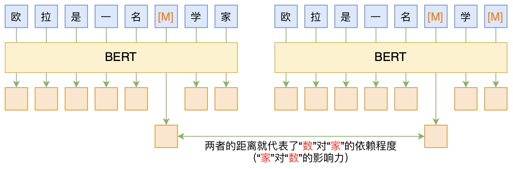 我们用$H(\boldsymbol{x})$表示序列$\boldsymbol{x}$经过BERT编码器后的输出序列,而$H(\boldsymbol{x})_i$则表示第$i$个token所对应的编码向量,另外,$\boldsymbol{x}\backslash \{x_i\}$表示将第$i$个token替换为$\text{[MASK]}$后的序列,$\boldsymbol{x}\backslash \{x_i,x_j\}$表示将第$i,j$个token都替换为$\text{[MASK]}$后的序列。设$f(x_i, x_j)$表示第$i$个token对第$j$个token的依赖程度,或者说第$j$个token对第$i$个token的“影响力”,那么我们将其定义为