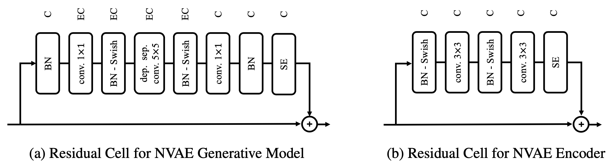 这种多尺度设计在当前最先进的生成模型都有体现,比如StyleGAN、BigGAN、VQ-VAE-2等,这说明多尺度设计的有效性已经得到比较充分的验证。此外,为了保证性能,NVAE还对残差模块的设计做了仔细的筛选,最后才确定了如下的残差模块,这炼丹不可谓不充分极致了: