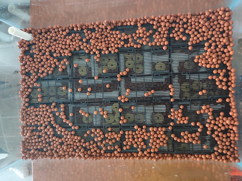 同程底滤的做法网上已经有不少教程,笔者主要的区别就是将底砂全部换成了1cm大小的陶粒(共40斤)。陶粒既可以当作砂来使用,又可以当作滤材来使用,它本身是多孔结构,可以用来净水培菌,相比之下常规通常底滤的底砂用的是铁胆砂之类的,起不到这个作用。此外,笔者选择陶粒还有一个原因,就是它大小均匀而且适当,所以它可以用来填充管道的缝隙,使得从外部看好像就只有一层厚厚的陶粒底砂一样,有种“暗藏玄机”的感觉,也比较简洁美观。
