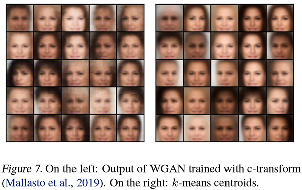 首先,论文比较了梯度惩罚(GP)与一种称为$c\text{-transform}$的方法在实现WGAN时的效果。$c\text{-transform}$同样提出自论文《How Well Do WGANs Estimate the Wasserstein Metric?》,它相比梯度惩罚能更好地近似Wasserstein距离。下面两个图也表明了这一点: