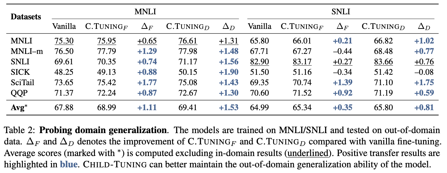 从表中可以看出,对于ChildTuning-D来说,几乎所有任务上都取得了提升,而ChildTuning-F也在不少任务上有效。另外,看论文描述可以知道上面给出的都是large版本模型的结果,而私下跟作者交流的时候,作者表示base版本的效果也有提升,只是限于论文篇幅,没有贴出来。