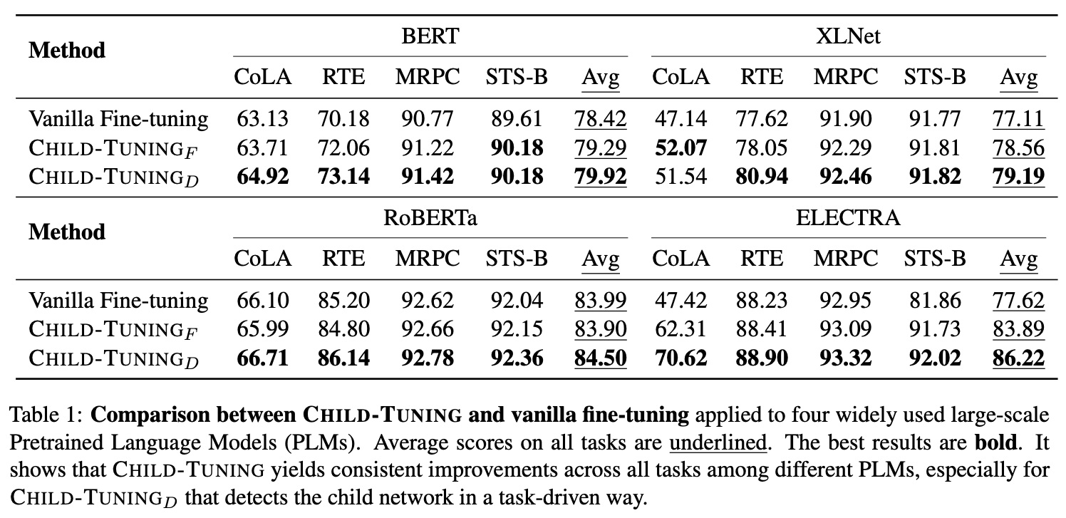 简单来说,这篇论文主要提出了一种名为“ChildTuning”的思路,来提高预训练模型在finetune时的效果,其中“Child”是“Children Network”的意思,指的是从预训练模型中选择一个子网络进行优化,缓解优化整个模型所带来的过拟合风险。其中,在子网络的选择上,又分为两种方式:ChildTuning-D和ChildTuning-F。