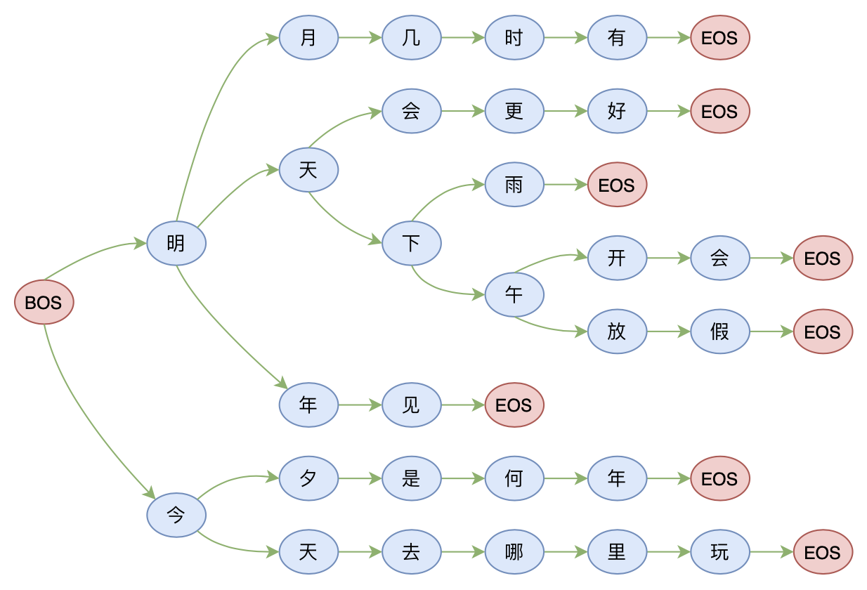 其实就是从左往右地把相同位置的相同token聚合起来,树上的每一条完整路径(以[BOS]开头、[EOS]结尾)都代表数据库中的一个句子。之所以叫“前缀树”,是因为利用这种树状结构,我们可以很快地查找到以某个前缀开头的字/句有哪些。比如从上图中我们可以看到,第一个字只可能是“明”或“今”,“明”后面只能接“月”、“天”或“年”,“明天”后面只能接“会”或“下”,等等。