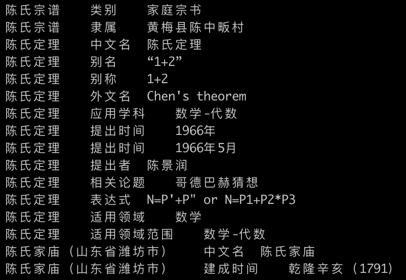 KgCLUE是CLUE组织最近推出的一个中文知识图谱问答的评测任务,数据比较规范,适合科研实验测试。具体来说,它以约2000万个三元组为知识库,每个三元组是$(S, P, O)$的格式(Subject-Predicate-Object),如下图: