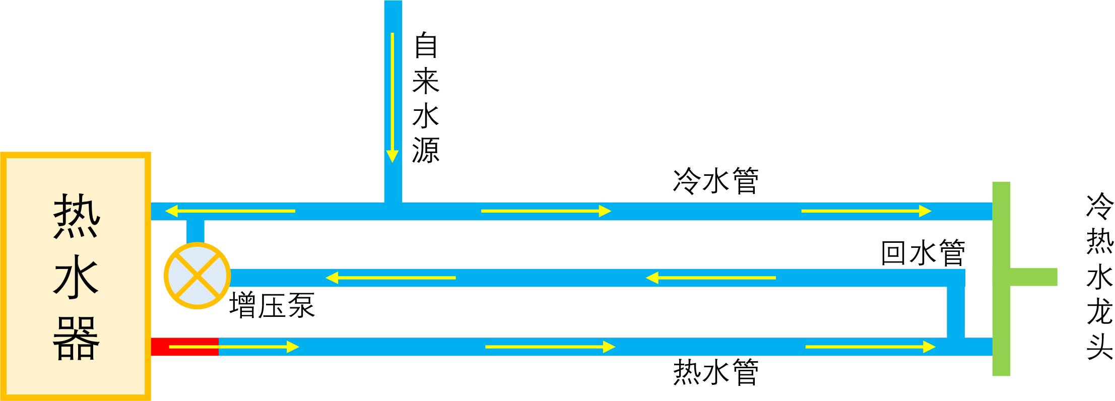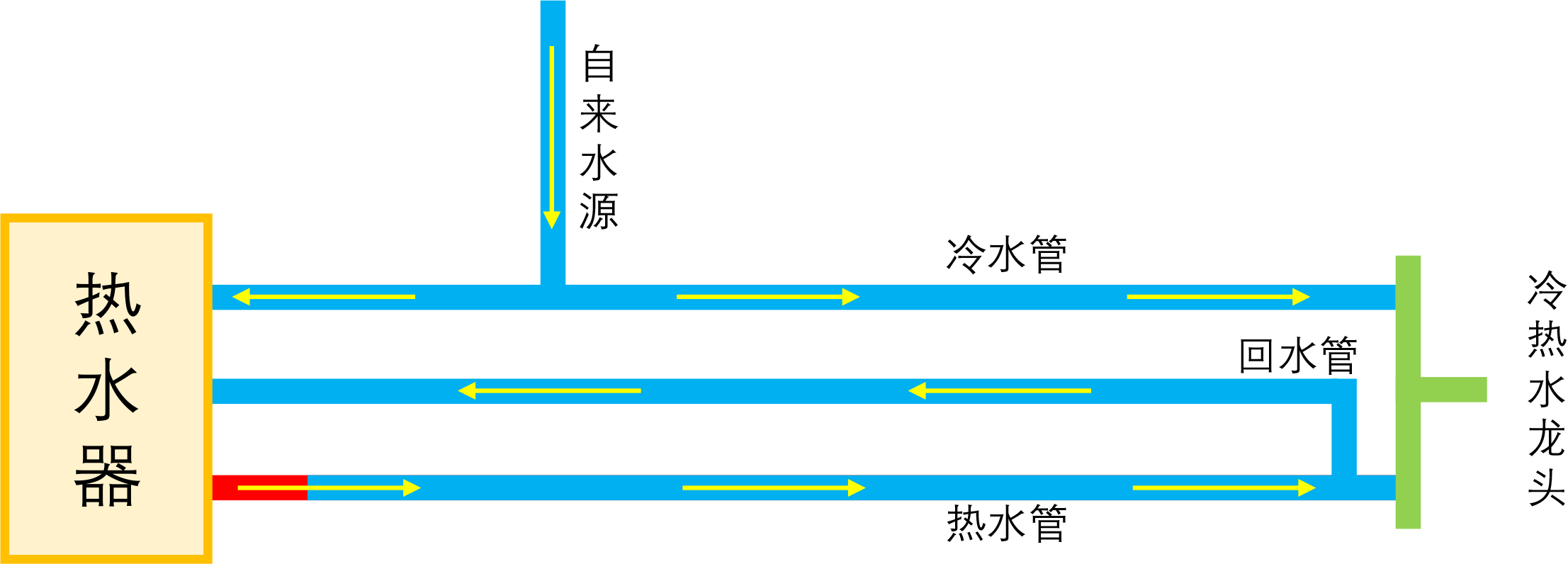 简单起见,我们先简化问题,假设家里只有一个热水用水点,那么其水路可以简化为下图: