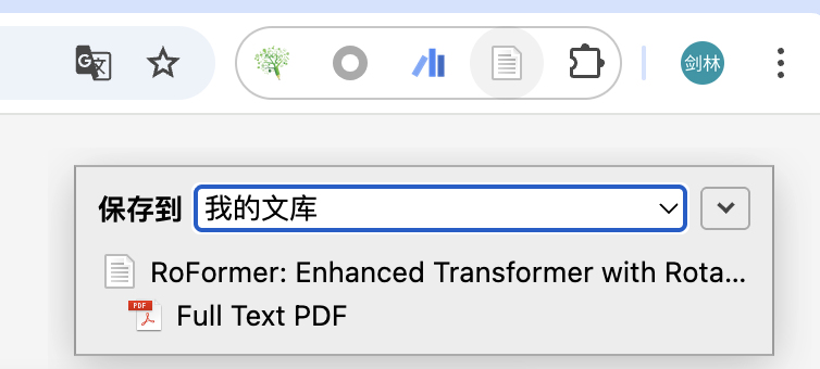 首先,我们需要安装Zotero(这是废话),然后需要给所用浏览器安装Zotero Connector插件。安装完成后,我们访问Cool Papers的单篇论文页面,如 https://papers.cool/arxiv/2104.09864 或 https://papers.cool/venue/2024.naacl-long.431@ACL ,然后点击Zotero Connector的图标,就会自动把论文导入了,包括PDF文件。