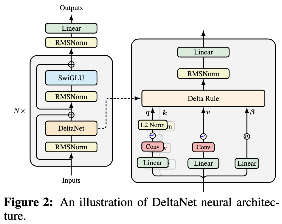 By 苏剑林 | 2025-10-05 | 36960位读者 | 引用如果读者有关注模型架构方面的进展,那么就会发现,比较新的线性Attention(参考《线性注意力简史:从模仿、创新到反哺》)模型都给$\boldsymbol{Q},\boldsymbol{K},\boldsymbol{V}$加上了Short Conv,比如下图所示的DeltaNet: