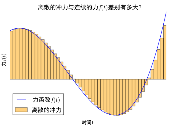 当然,以上只是笔者小时候的一个“异想天开”的念头,读者不必较真。不过,这个疑问跟本文有什么联系呢?我们在研究振动问题之时,通常会遇到在变力的作用下的受迫振动问题,已知变力是时间的函数,比如$f(t)$,然而,虽然知道$f(t)$的具体形式,但是由于$f$的非线性性,加上外力之后的运动,不一定容易求解。然而,如果可以将一个变化的力分段为无数个无穷小时间内的恒力(冲力),那么我们就可以分段讨论我们要研究的运动,而通常来说,恒力的问题会比变力容易。将一个变力离散化,然后再取极限,那么是不是跟原来在变力下的运动是一样的呢?这跟文章开头的疑问有着类似的思想——离线的极限,跟连续本身,是不是等价的?而让人惊喜的是,在通常的物理系统中,将力分段为无数个小区间内的恒力的做法,能够导致正确的答案,而且,这恰好是线性常微分方程的格林函数法。下面我们来分析这一做法。